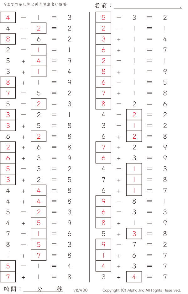 上記のボタンから「9までの足し算と引き算」の算数数学ドリル・計算ドリル(PDFプリント)がダウンロードできます。個人利用は無料です(家庭以外での配布は有料です)。