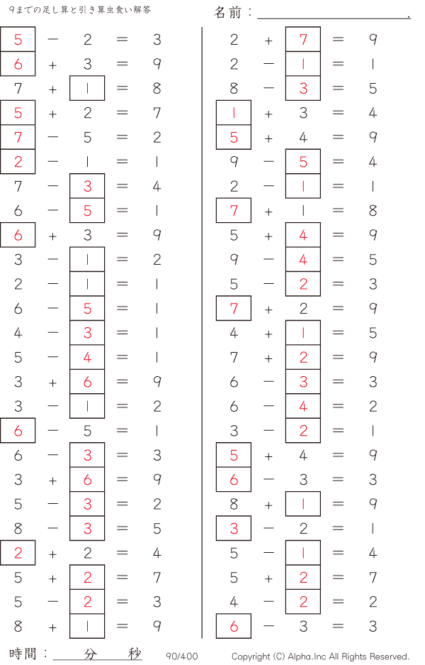 上記のボタンから「9までの足し算と引き算」の算数数学ドリル・計算ドリル(PDFプリント)がダウンロードできます。個人利用は無料です(家庭以外での配布は有料です)。