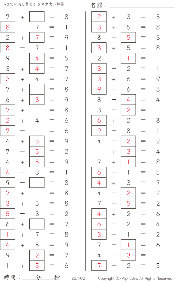 上記のボタンから「9までの足し算と引き算」の算数数学ドリル・計算ドリル(PDFプリント)がダウンロードできます。個人利用は無料です(家庭以外での配布は有料です)。