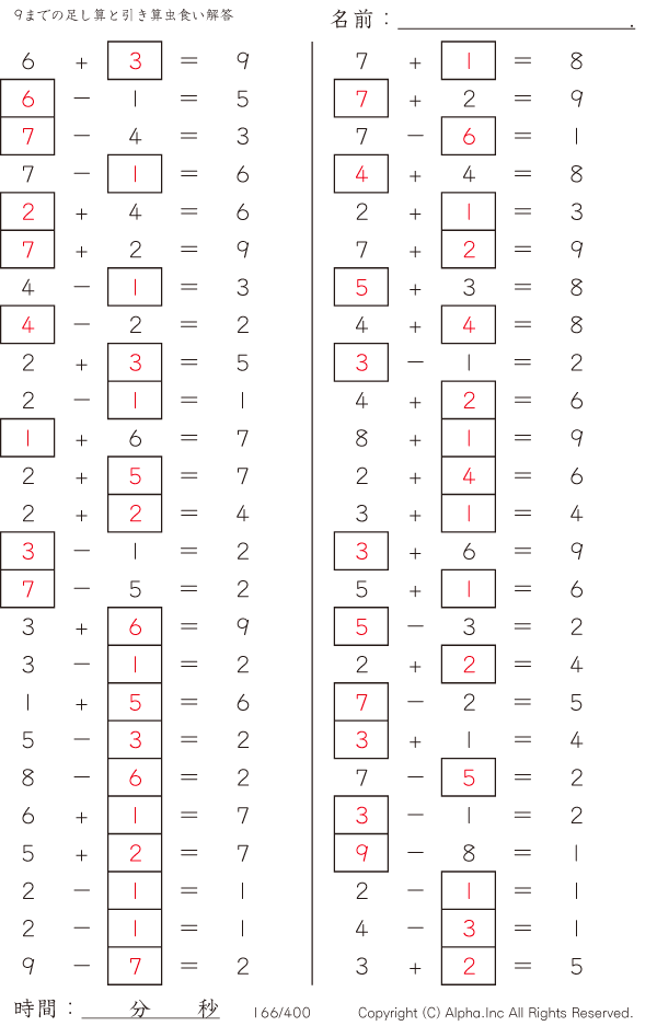 上記のボタンから「9までの足し算と引き算」の算数数学ドリル・計算ドリル(PDFプリント)がダウンロードできます。個人利用は無料です(家庭以外での配布は有料です)。