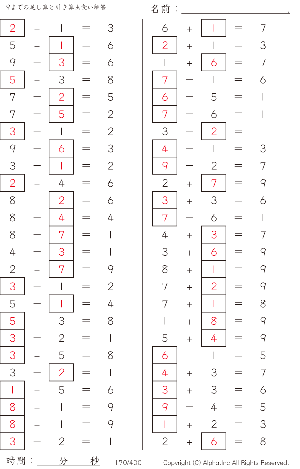 上記のボタンから「9までの足し算と引き算」の算数数学ドリル・計算ドリル(PDFプリント)がダウンロードできます。個人利用は無料です(家庭以外での配布は有料です)。