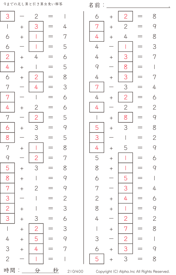 上記のボタンから「9までの足し算と引き算」の算数数学ドリル・計算ドリル(PDFプリント)がダウンロードできます。個人利用は無料です(家庭以外での配布は有料です)。
