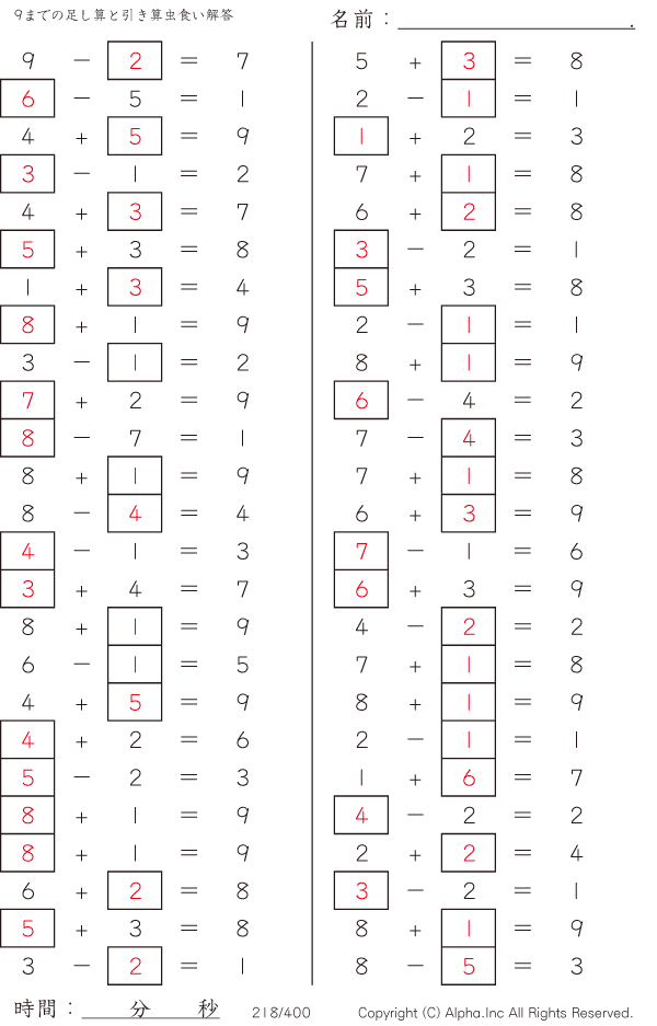上記のボタンから「9までの足し算と引き算」の算数数学ドリル・計算ドリル(PDFプリント)がダウンロードできます。個人利用は無料です(家庭以外での配布は有料です)。