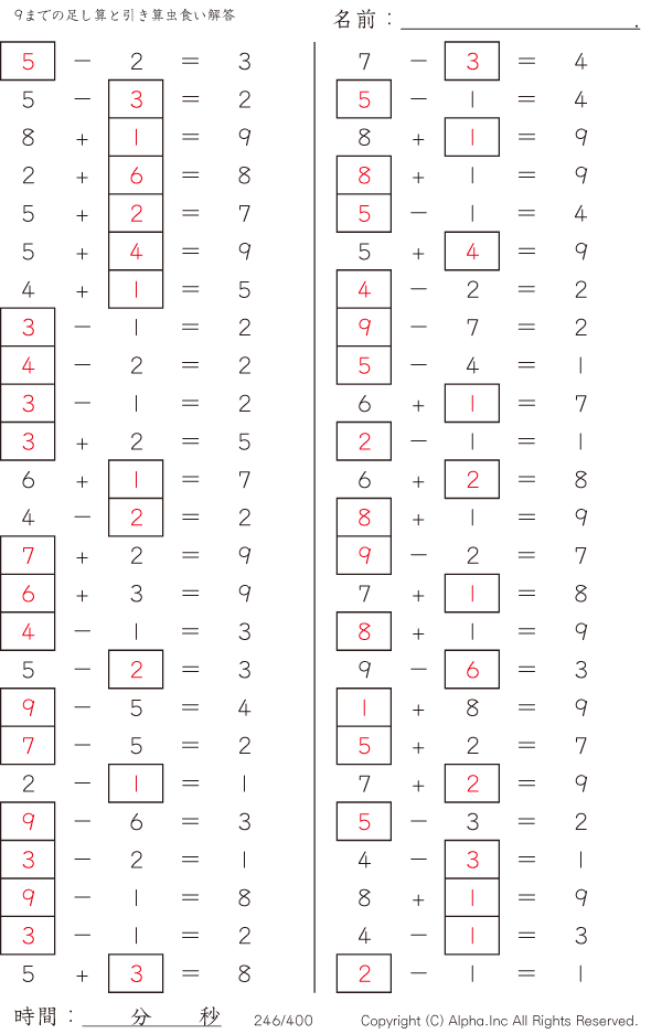 上記のボタンから「9までの足し算と引き算」の算数数学ドリル・計算ドリル(PDFプリント)がダウンロードできます。個人利用は無料です(家庭以外での配布は有料です)。