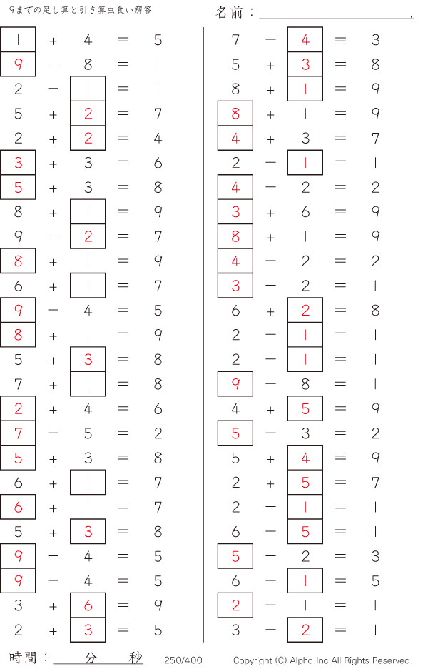 上記のボタンから「9までの足し算と引き算」の算数数学ドリル・計算ドリル(PDFプリント)がダウンロードできます。個人利用は無料です(家庭以外での配布は有料です)。
