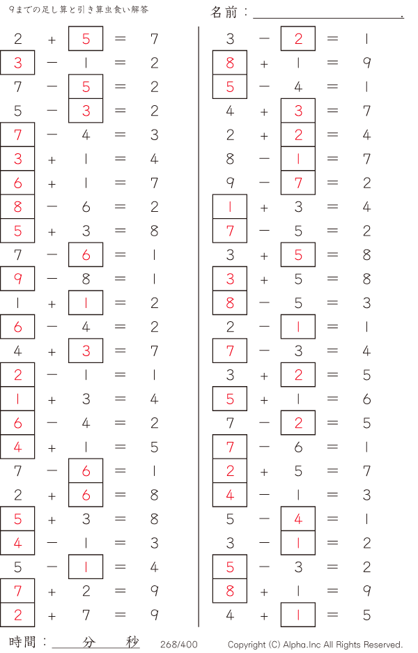 上記のボタンから「9までの足し算と引き算」の算数数学ドリル・計算ドリル(PDFプリント)がダウンロードできます。個人利用は無料です(家庭以外での配布は有料です)。