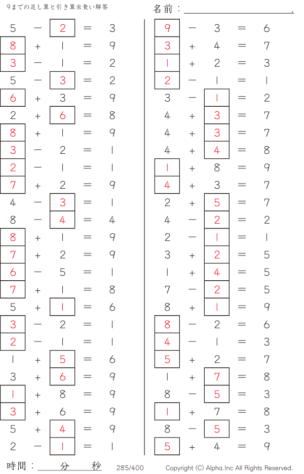 上記のボタンから「9までの足し算と引き算」の算数数学ドリル・計算ドリル(PDFプリント)がダウンロードできます。個人利用は無料です(家庭以外での配布は有料です)。