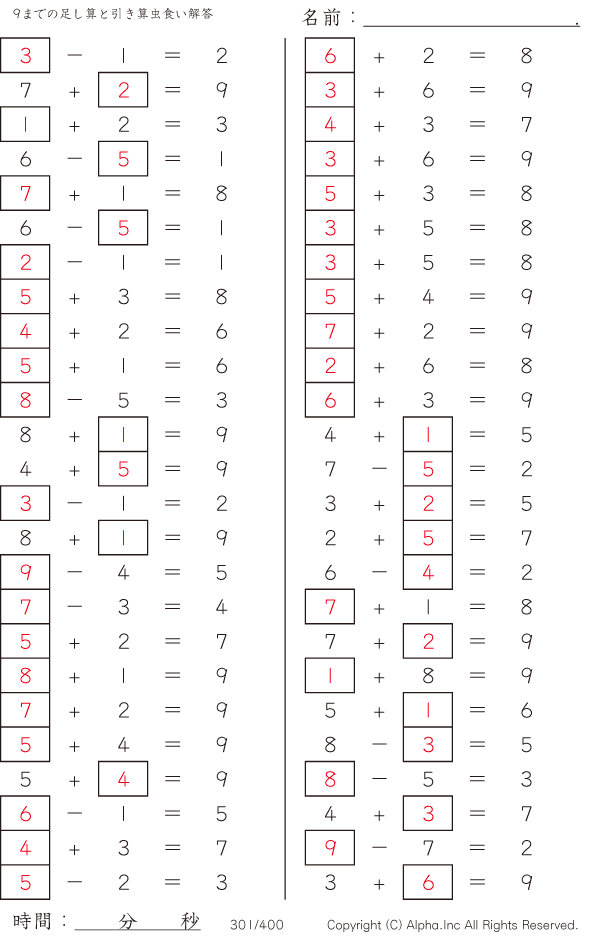 上記のボタンから「9までの足し算と引き算」の算数数学ドリル・計算ドリル(PDFプリント)がダウンロードできます。個人利用は無料です(家庭以外での配布は有料です)。