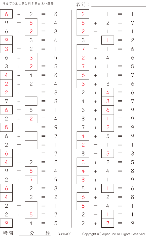 上記のボタンから「9までの足し算と引き算」の算数数学ドリル・計算ドリル(PDFプリント)がダウンロードできます。個人利用は無料です(家庭以外での配布は有料です)。