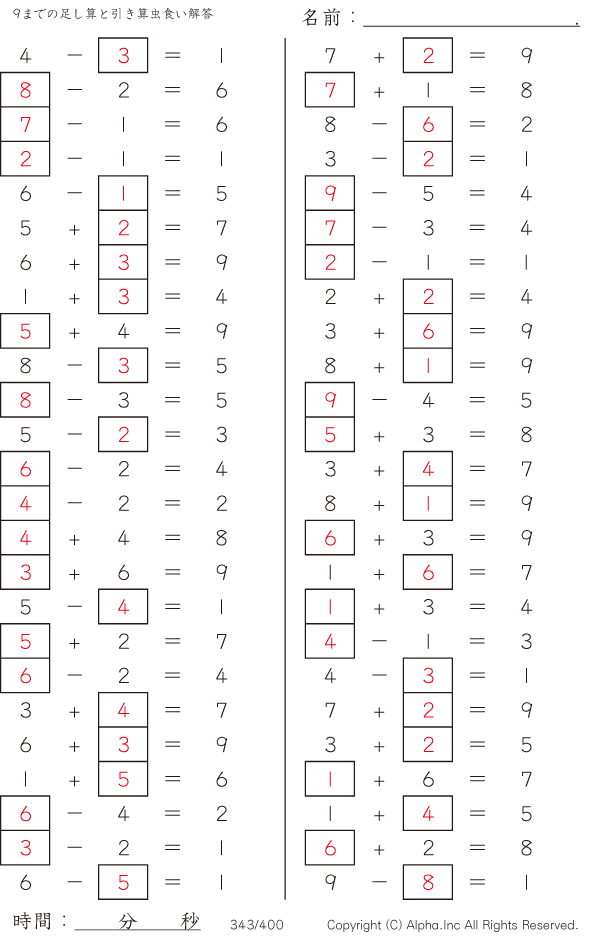 上記のボタンから「9までの足し算と引き算」の算数数学ドリル・計算ドリル(PDFプリント)がダウンロードできます。個人利用は無料です(家庭以外での配布は有料です)。