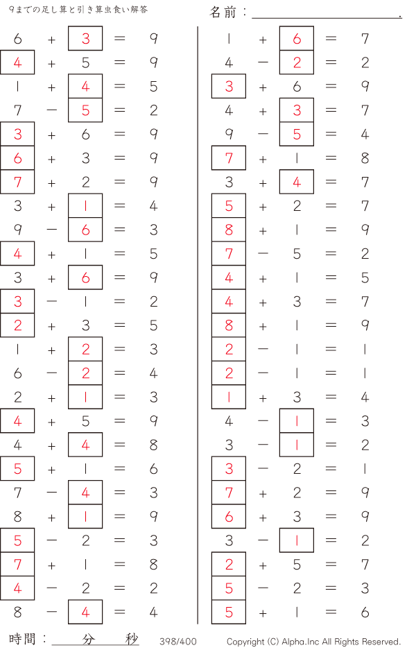 上記のボタンから「9までの足し算と引き算」の算数数学ドリル・計算ドリル(PDFプリント)がダウンロードできます。個人利用は無料です(家庭以外での配布は有料です)。