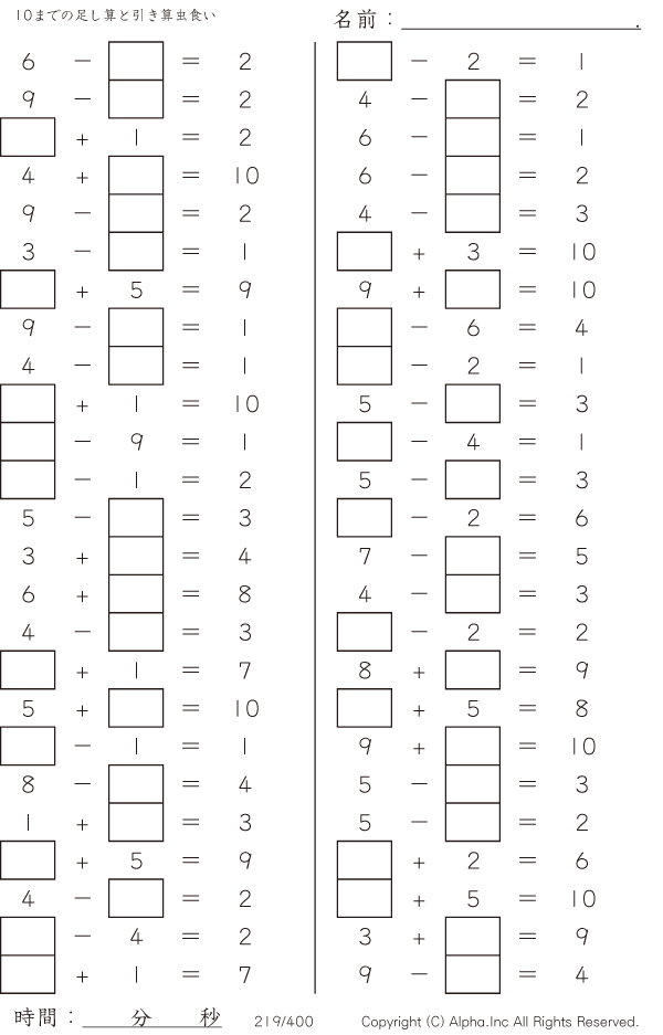 上記のボタンから「10までの足し算と引き算」の算数数学ドリル・計算ドリル(PDFプリント)がダウンロードできます。個人利用は無料です(家庭以外での配布は有料です)。