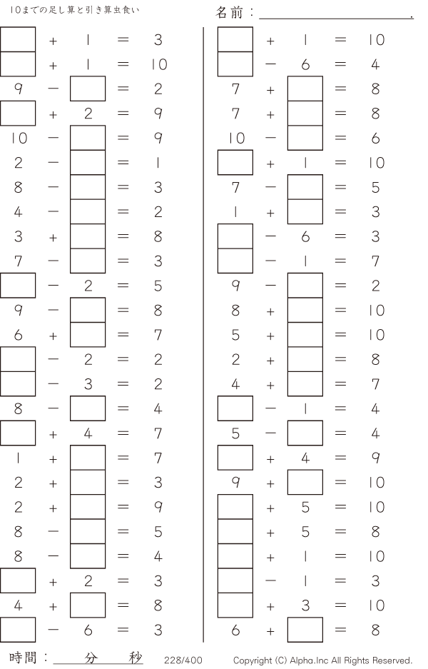 上記のボタンから「10までの足し算と引き算」の算数数学ドリル・計算ドリル(PDFプリント)がダウンロードできます。個人利用は無料です(家庭以外での配布は有料です)。
