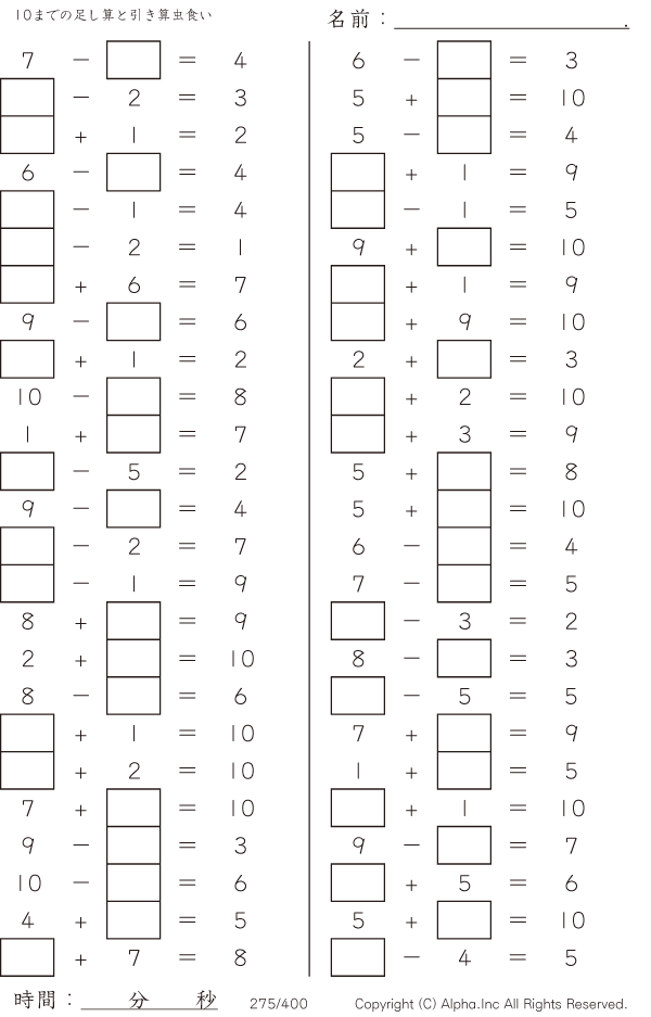 上記のボタンから「10までの足し算と引き算」の算数数学ドリル・計算ドリル(PDFプリント)がダウンロードできます。個人利用は無料です(家庭以外での配布は有料です)。