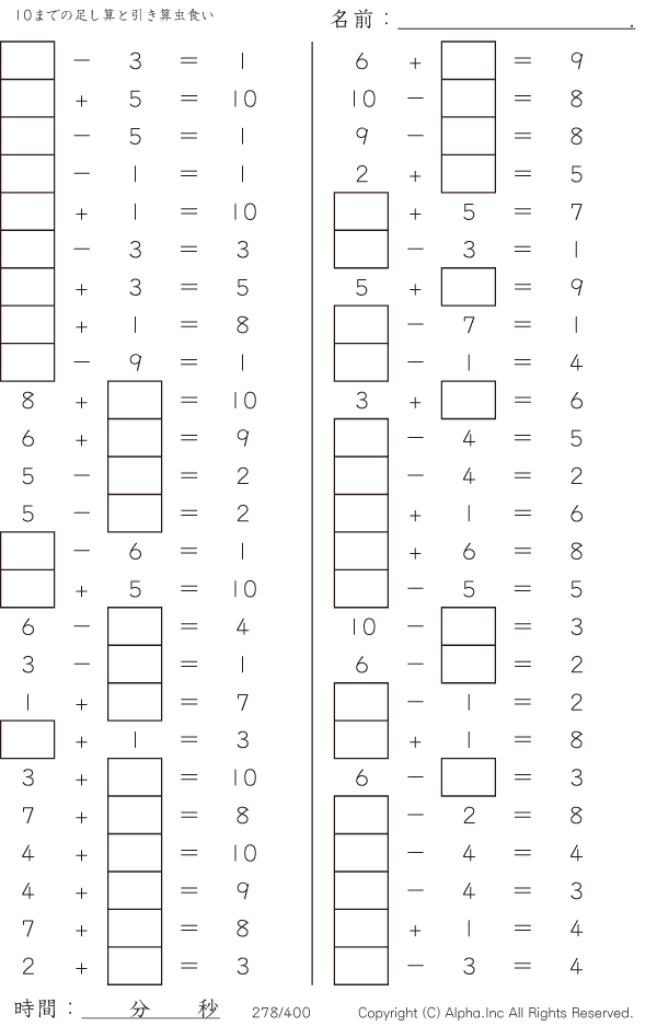 上記のボタンから「10までの足し算と引き算」の算数数学ドリル・計算ドリル(PDFプリント)がダウンロードできます。個人利用は無料です(家庭以外での配布は有料です)。