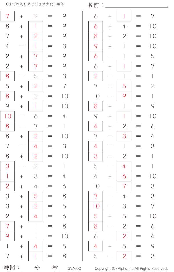 上記のボタンから「10までの足し算と引き算」の算数数学ドリル・計算ドリル(PDFプリント)がダウンロードできます。個人利用は無料です(家庭以外での配布は有料です)。