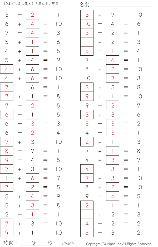 上記のボタンから「10までの足し算と引き算」の算数数学ドリル・計算ドリル(PDFプリント)がダウンロードできます。個人利用は無料です(家庭以外での配布は有料です)。