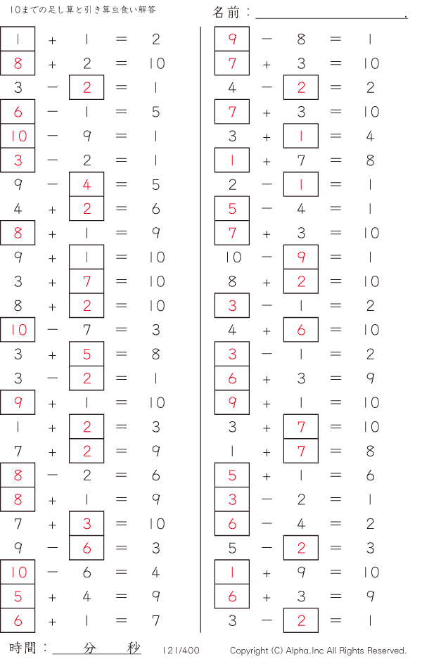 上記のボタンから「10までの足し算と引き算」の算数数学ドリル・計算ドリル(PDFプリント)がダウンロードできます。個人利用は無料です(家庭以外での配布は有料です)。