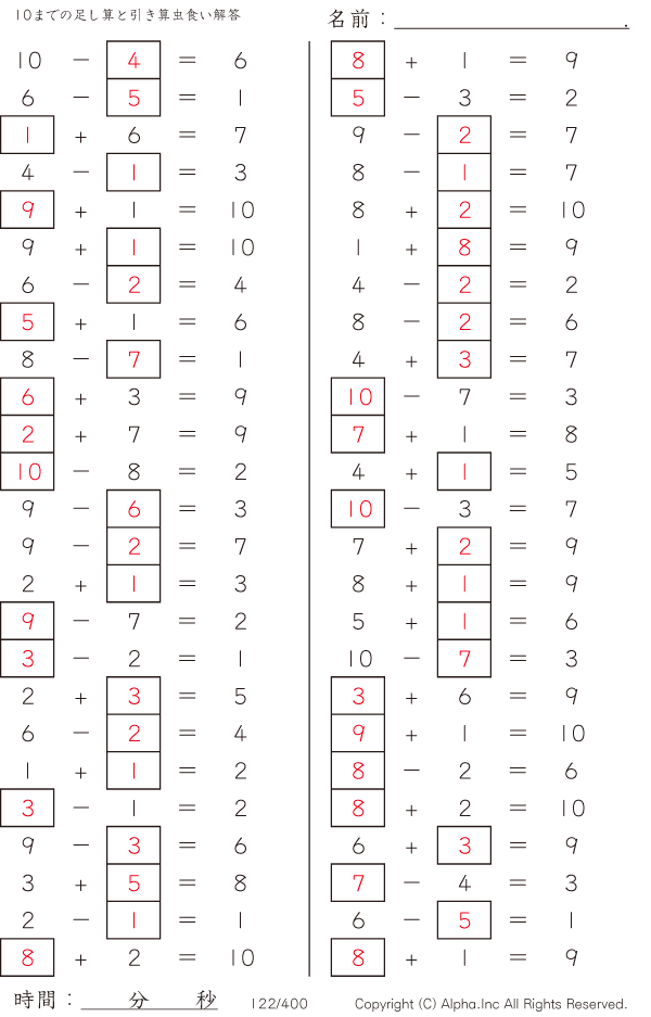 上記のボタンから「10までの足し算と引き算」の算数数学ドリル・計算ドリル(PDFプリント)がダウンロードできます。個人利用は無料です(家庭以外での配布は有料です)。