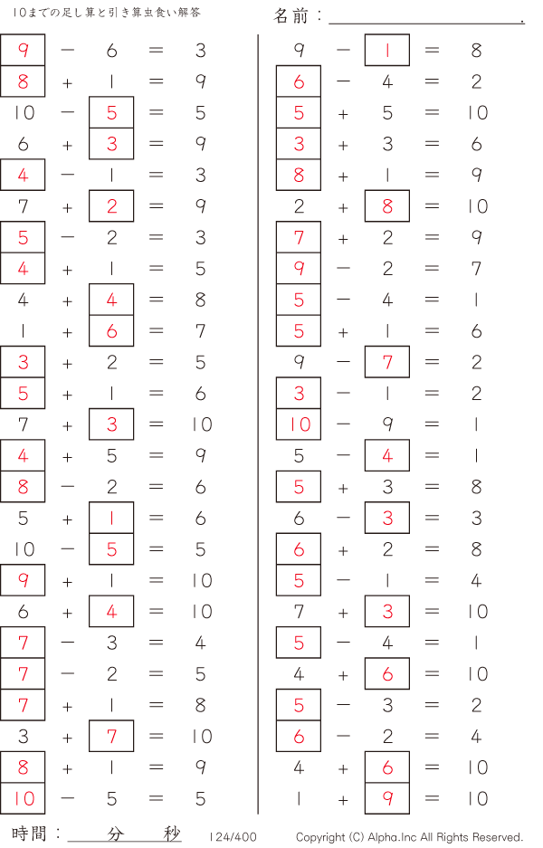 上記のボタンから「10までの足し算と引き算」の算数数学ドリル・計算ドリル(PDFプリント)がダウンロードできます。個人利用は無料です(家庭以外での配布は有料です)。