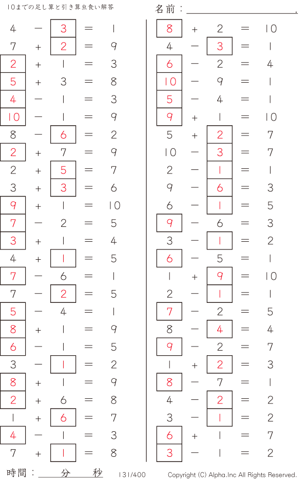 上記のボタンから「10までの足し算と引き算」の算数数学ドリル・計算ドリル(PDFプリント)がダウンロードできます。個人利用は無料です(家庭以外での配布は有料です)。