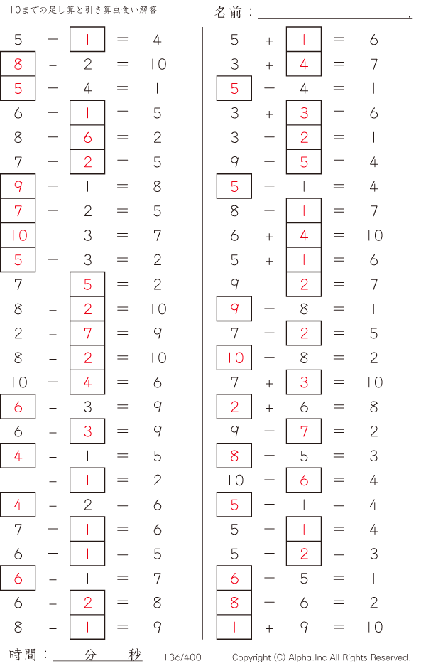 上記のボタンから「10までの足し算と引き算」の算数数学ドリル・計算ドリル(PDFプリント)がダウンロードできます。個人利用は無料です(家庭以外での配布は有料です)。
