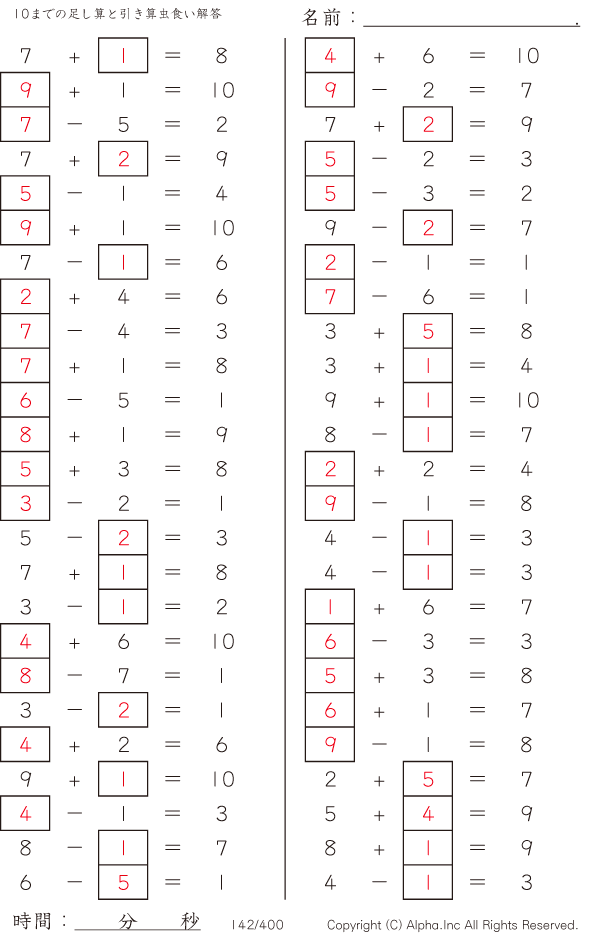 上記のボタンから「10までの足し算と引き算」の算数数学ドリル・計算ドリル(PDFプリント)がダウンロードできます。個人利用は無料です(家庭以外での配布は有料です)。