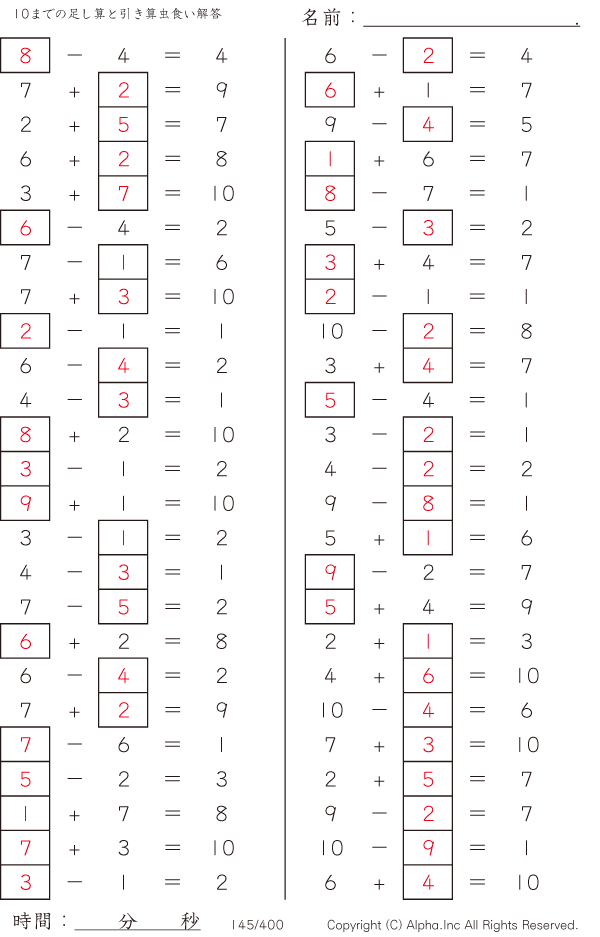 上記のボタンから「10までの足し算と引き算」の算数数学ドリル・計算ドリル(PDFプリント)がダウンロードできます。個人利用は無料です(家庭以外での配布は有料です)。