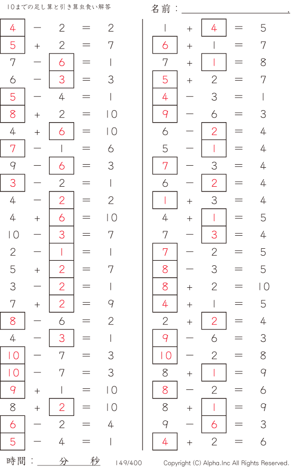 上記のボタンから「10までの足し算と引き算」の算数数学ドリル・計算ドリル(PDFプリント)がダウンロードできます。個人利用は無料です(家庭以外での配布は有料です)。