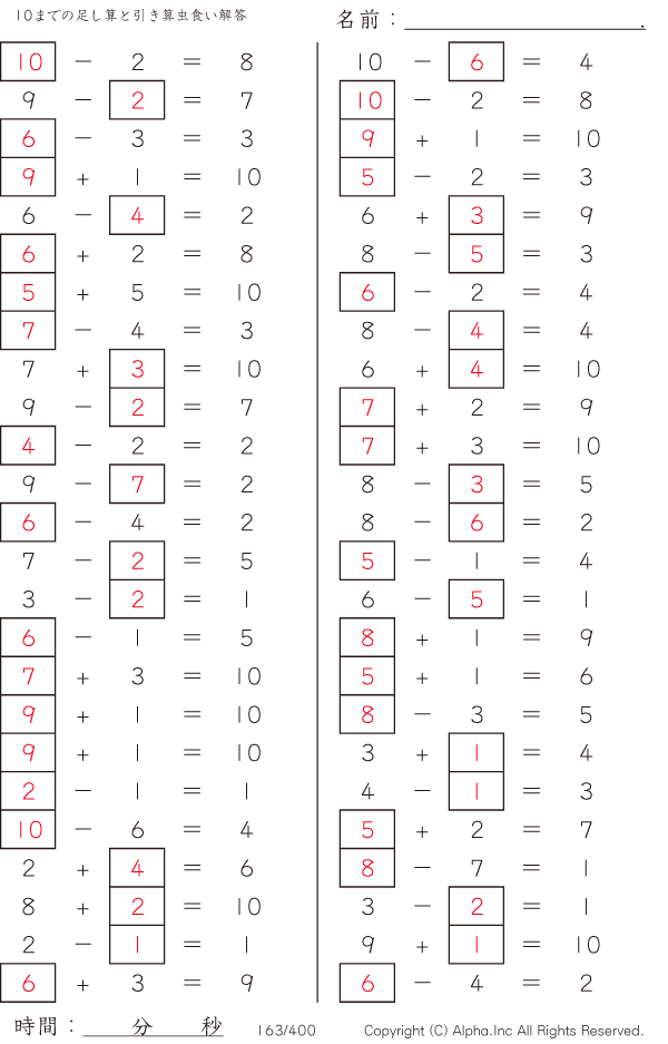 上記のボタンから「10までの足し算と引き算」の算数数学ドリル・計算ドリル(PDFプリント)がダウンロードできます。個人利用は無料です(家庭以外での配布は有料です)。