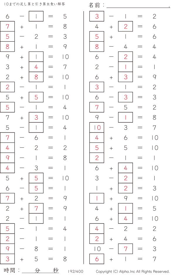 上記のボタンから「10までの足し算と引き算」の算数数学ドリル・計算ドリル(PDFプリント)がダウンロードできます。個人利用は無料です(家庭以外での配布は有料です)。
