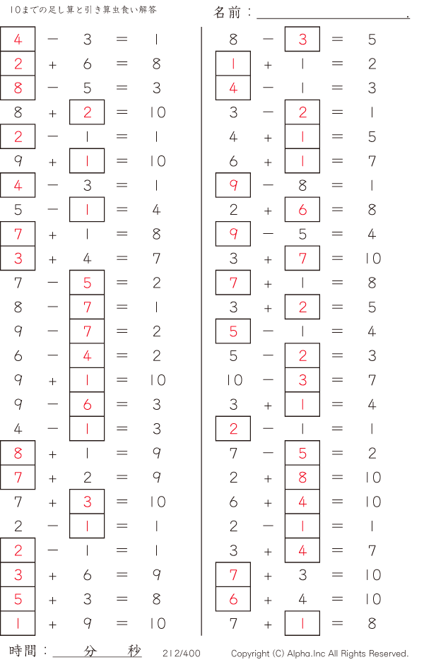 上記のボタンから「10までの足し算と引き算」の算数数学ドリル・計算ドリル(PDFプリント)がダウンロードできます。個人利用は無料です(家庭以外での配布は有料です)。