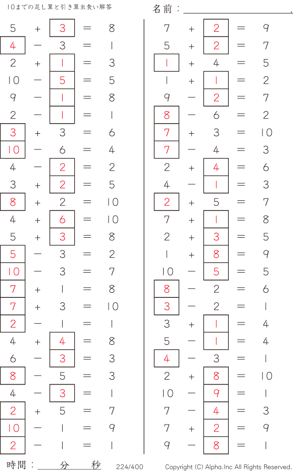 上記のボタンから「10までの足し算と引き算」の算数数学ドリル・計算ドリル(PDFプリント)がダウンロードできます。個人利用は無料です(家庭以外での配布は有料です)。