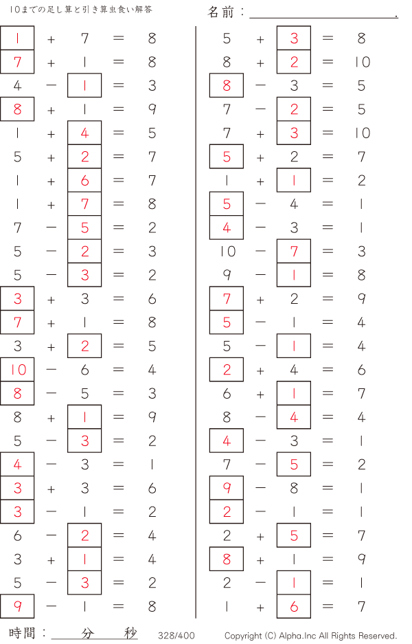 上記のボタンから「10までの足し算と引き算」の算数数学ドリル・計算ドリル(PDFプリント)がダウンロードできます。個人利用は無料です(家庭以外での配布は有料です)。