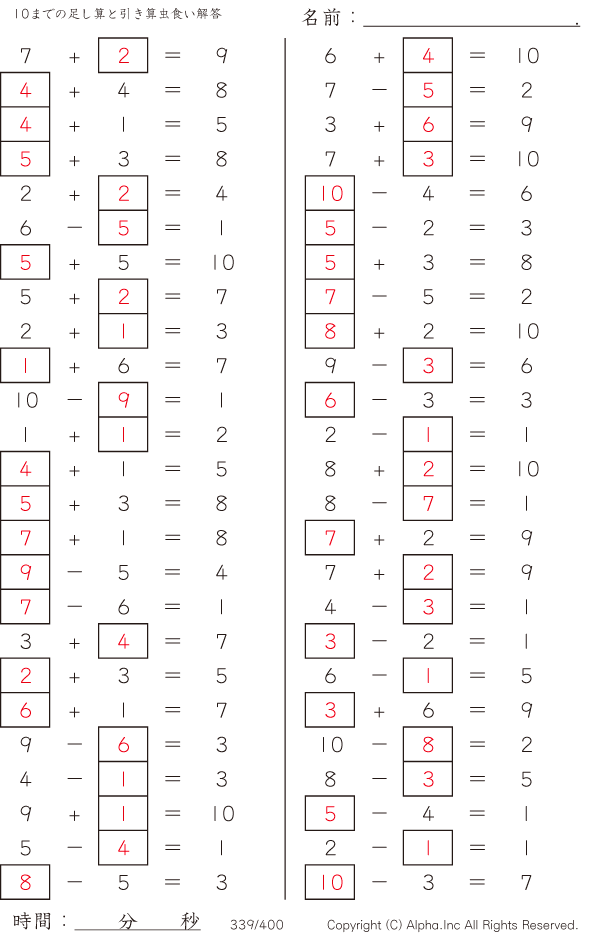 上記のボタンから「10までの足し算と引き算」の算数数学ドリル・計算ドリル(PDFプリント)がダウンロードできます。個人利用は無料です(家庭以外での配布は有料です)。