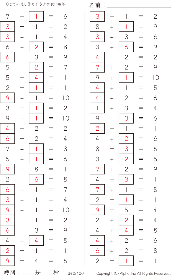 10までの足し算と引き算 [解答]342/400