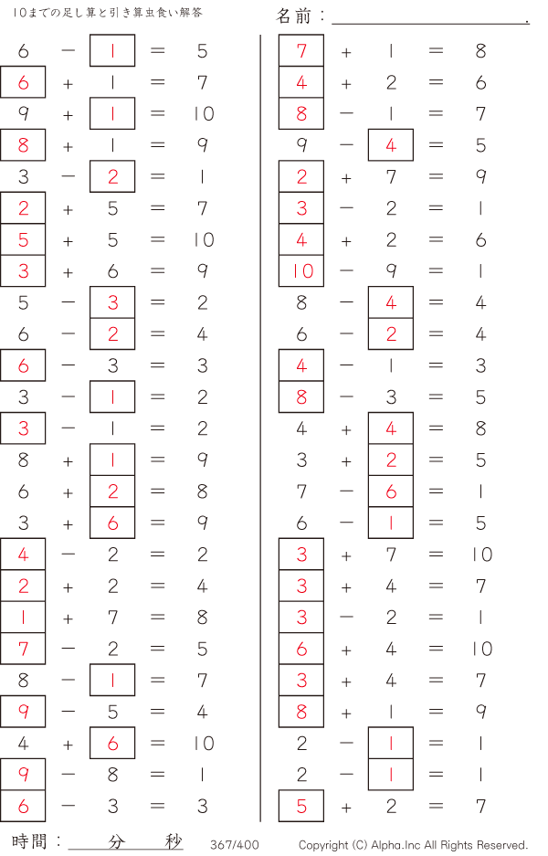 上記のボタンから「10までの足し算と引き算」の算数数学ドリル・計算ドリル(PDFプリント)がダウンロードできます。個人利用は無料です(家庭以外での配布は有料です)。