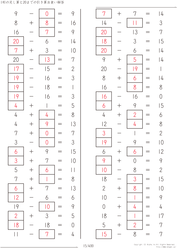 1桁の足し算と20までの引き算 [解答]015/400