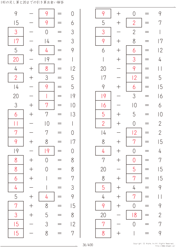 上記のボタンから「1桁の足し算と20までの引き算」の算数数学ドリル・計算ドリル(PDFプリント)がダウンロードできます。個人利用は無料です(家庭以外での配布は有料です)。