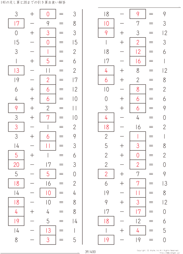 1桁の足し算と20までの引き算 [解答]039/400