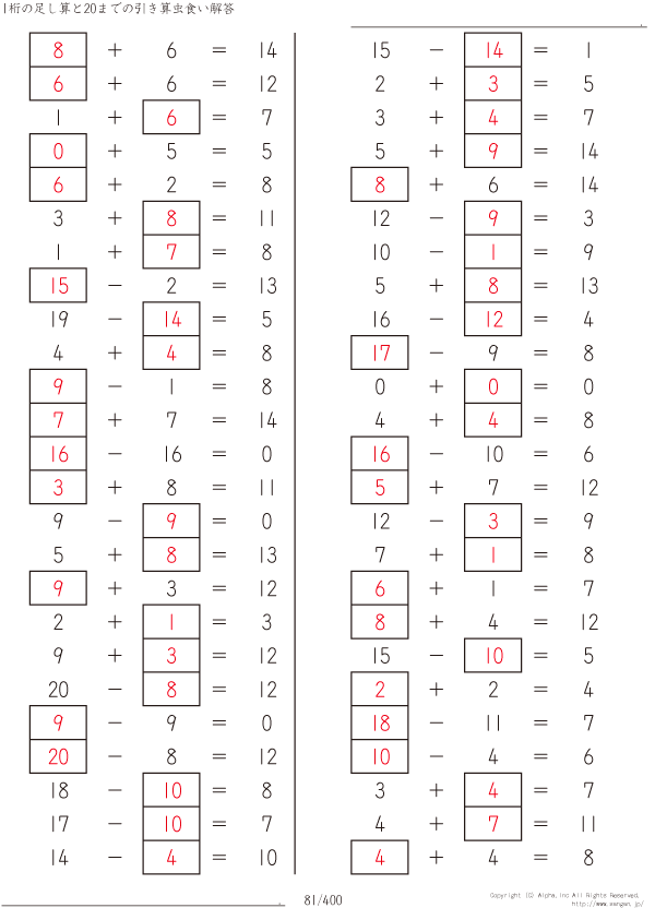 1桁の足し算と20までの引き算 [解答]081/400