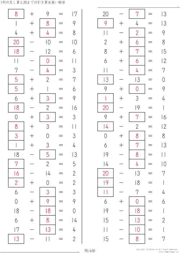 上記のボタンから「1桁の足し算と20までの引き算」の算数数学ドリル・計算ドリル(PDFプリント)がダウンロードできます。個人利用は無料です(家庭以外での配布は有料です)。