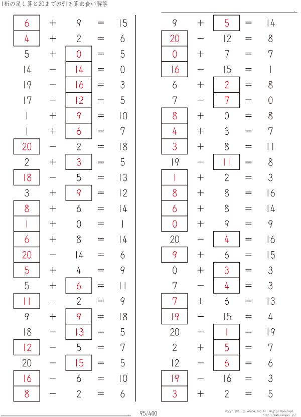上記のボタンから「1桁の足し算と20までの引き算」の算数数学ドリル・計算ドリル(PDFプリント)がダウンロードできます。個人利用は無料です(家庭以外での配布は有料です)。