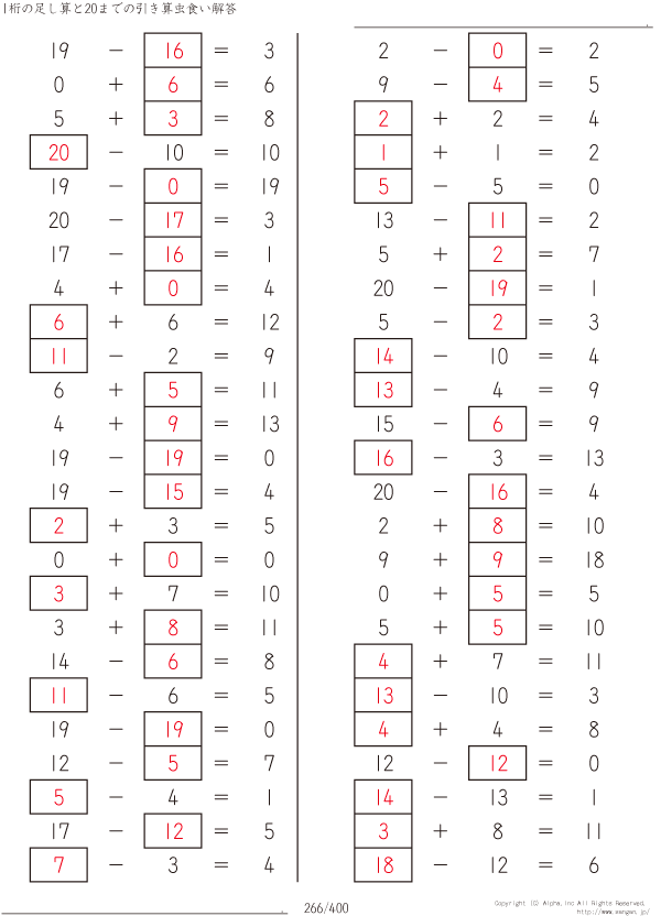 上記のボタンから「1桁の足し算と20までの引き算」の算数数学ドリル・計算ドリル(PDFプリント)がダウンロードできます。個人利用は無料です(家庭以外での配布は有料です)。