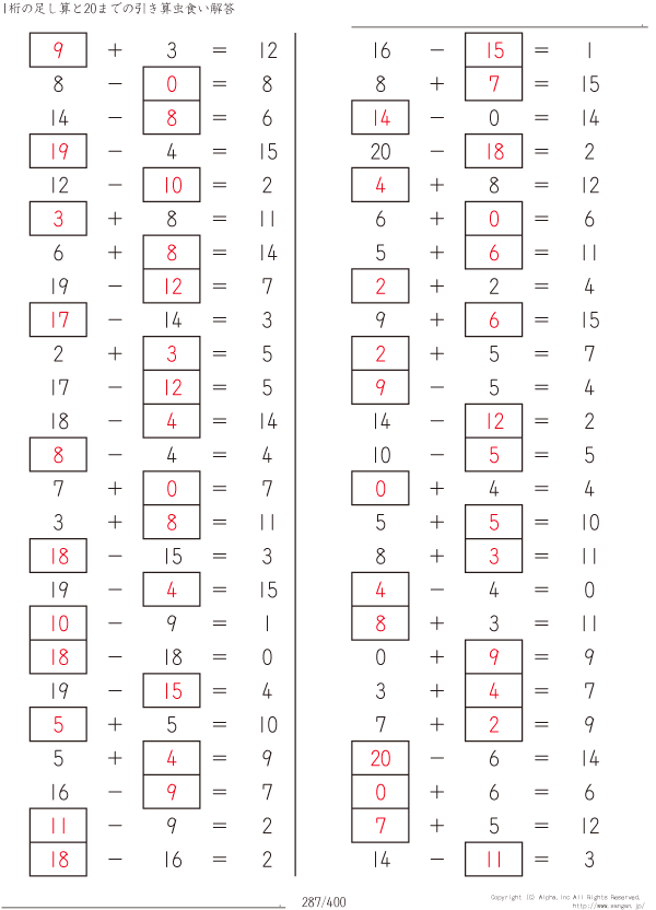 上記のボタンから「1桁の足し算と20までの引き算」の算数数学ドリル・計算ドリル(PDFプリント)がダウンロードできます。個人利用は無料です(家庭以外での配布は有料です)。