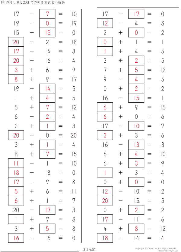 1桁の足し算と20までの引き算 [解答]314/400