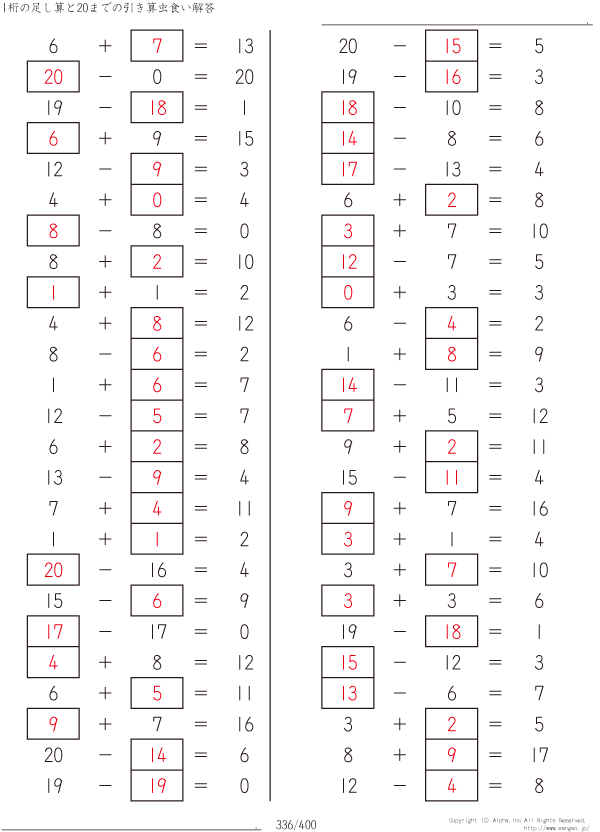 上記のボタンから「1桁の足し算と20までの引き算」の算数数学ドリル・計算ドリル(PDFプリント)がダウンロードできます。個人利用は無料です(家庭以外での配布は有料です)。