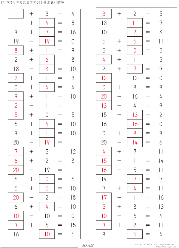 1桁の足し算と20までの引き算 [解答]346/400