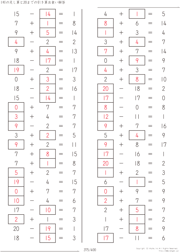 上記のボタンから「1桁の足し算と20までの引き算」の算数数学ドリル・計算ドリル(PDFプリント)がダウンロードできます。個人利用は無料です(家庭以外での配布は有料です)。