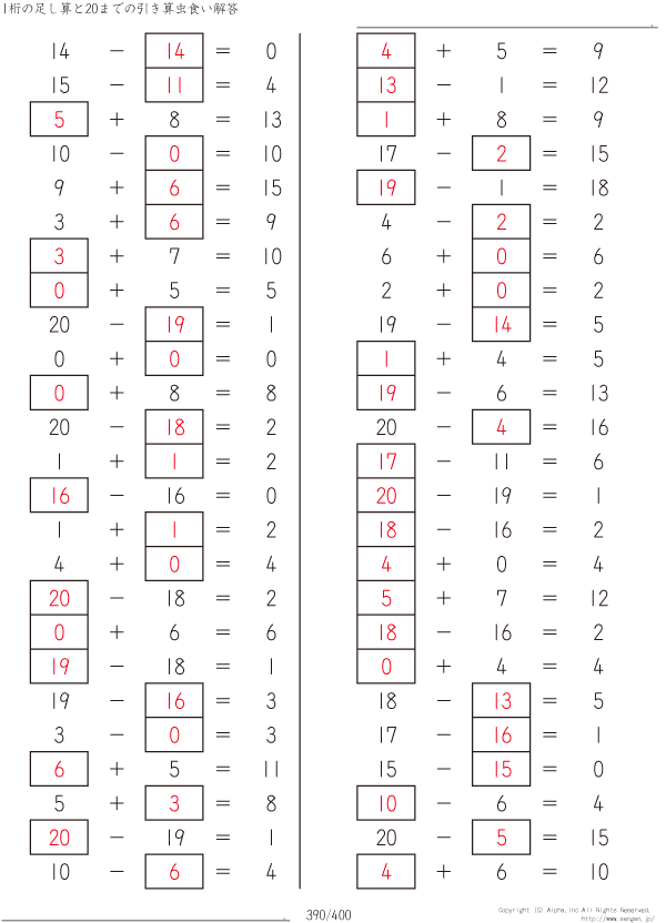 上記のボタンから「1桁の足し算と20までの引き算」の算数数学ドリル・計算ドリル(PDFプリント)がダウンロードできます。個人利用は無料です(家庭以外での配布は有料です)。